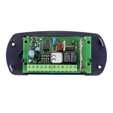 Récepteur Rolling Code 2 canaux avec connecteur à 10 voies (embrochable) ou avec bornier à 8 voies en box.
