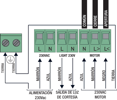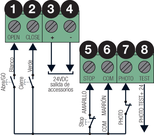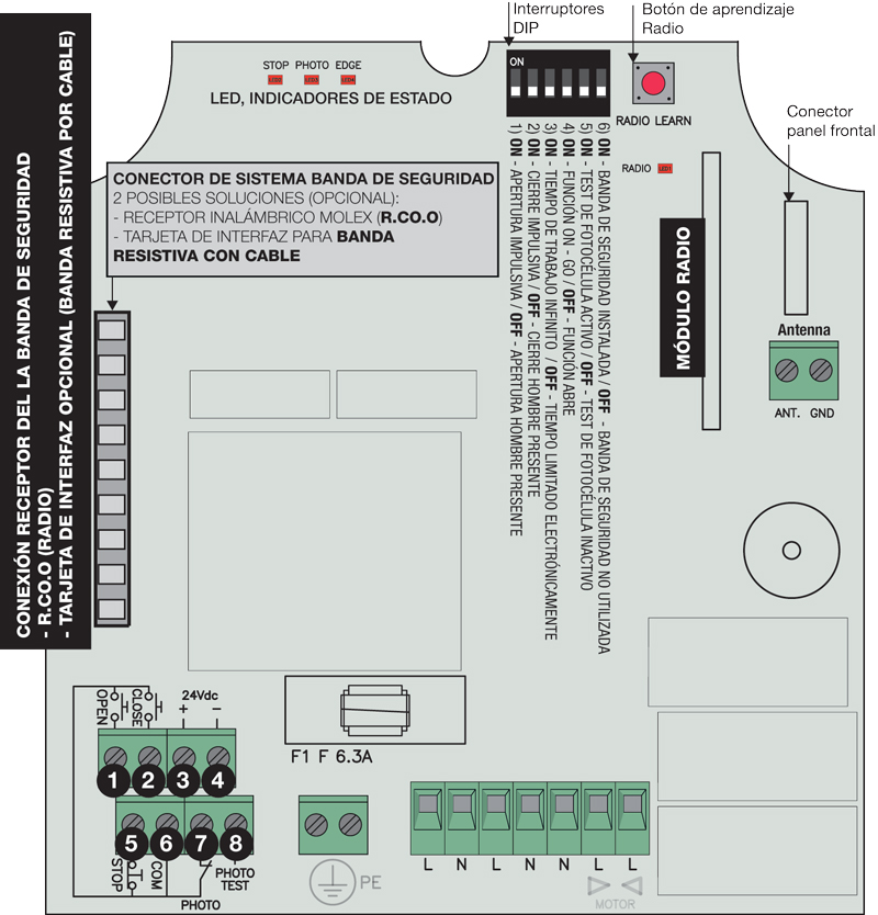 Entradas disponibles: botón de apertura, botón de cierre, botón de parada, fotocélula, receptor para banda de contacto de seguridad (conector R.CO.O), RJ11 para conexión de UPS.