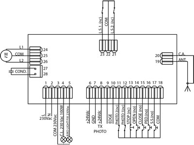 Inputs: open button, close button, step–by–step button, pedestrian button, stop button, 2 photocells, safety edge, open and close limit switch.