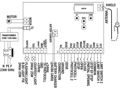 Entrées: ouvre, ferme, pas à pas, piéton, stop, 2 photocellules, barre palpeuse, fins de course d’ouverture et de fermeture.